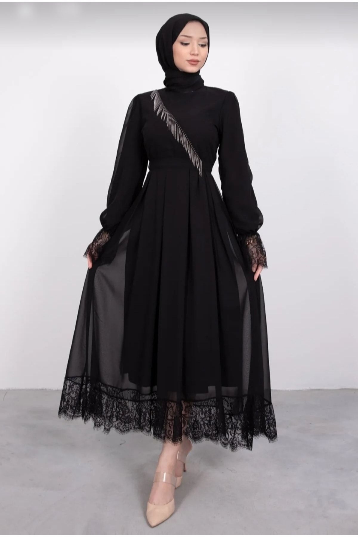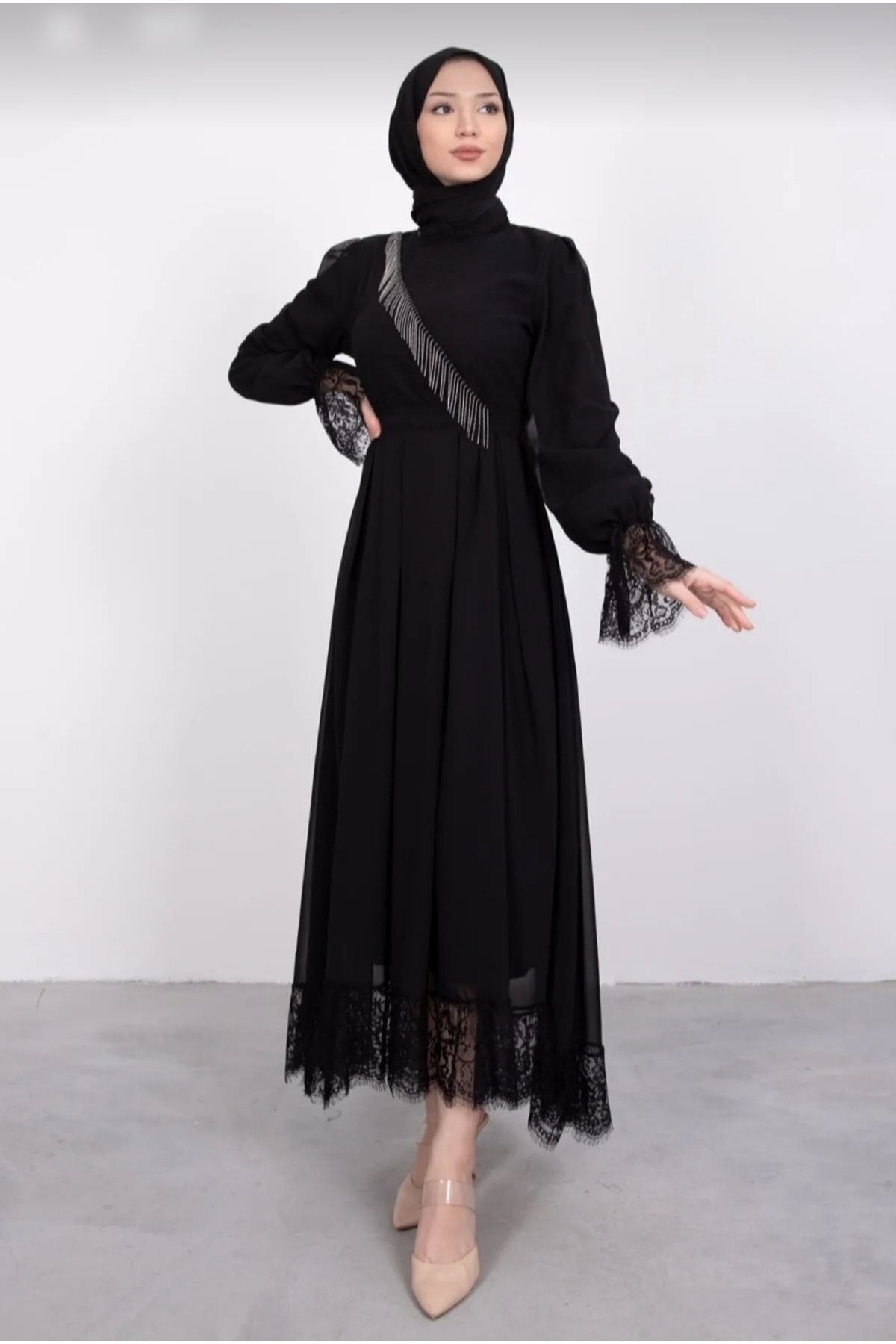 Çapraz Zincir Detaylı Asimetrik Tesettür Abiye Siyah, modern çizgileri ve sofistike detaylarıyla gardırobunuzun vazgeçilmezi olacak. Özenle seçilmiş kumaşı vücutta rahat durur ve hareket özgürlüğü sağlar. Farklı kombinlerle hem günlük hem de davet stilinizi oluşturabilirsiniz. reçko güvencesiyle sunulmaktadır.