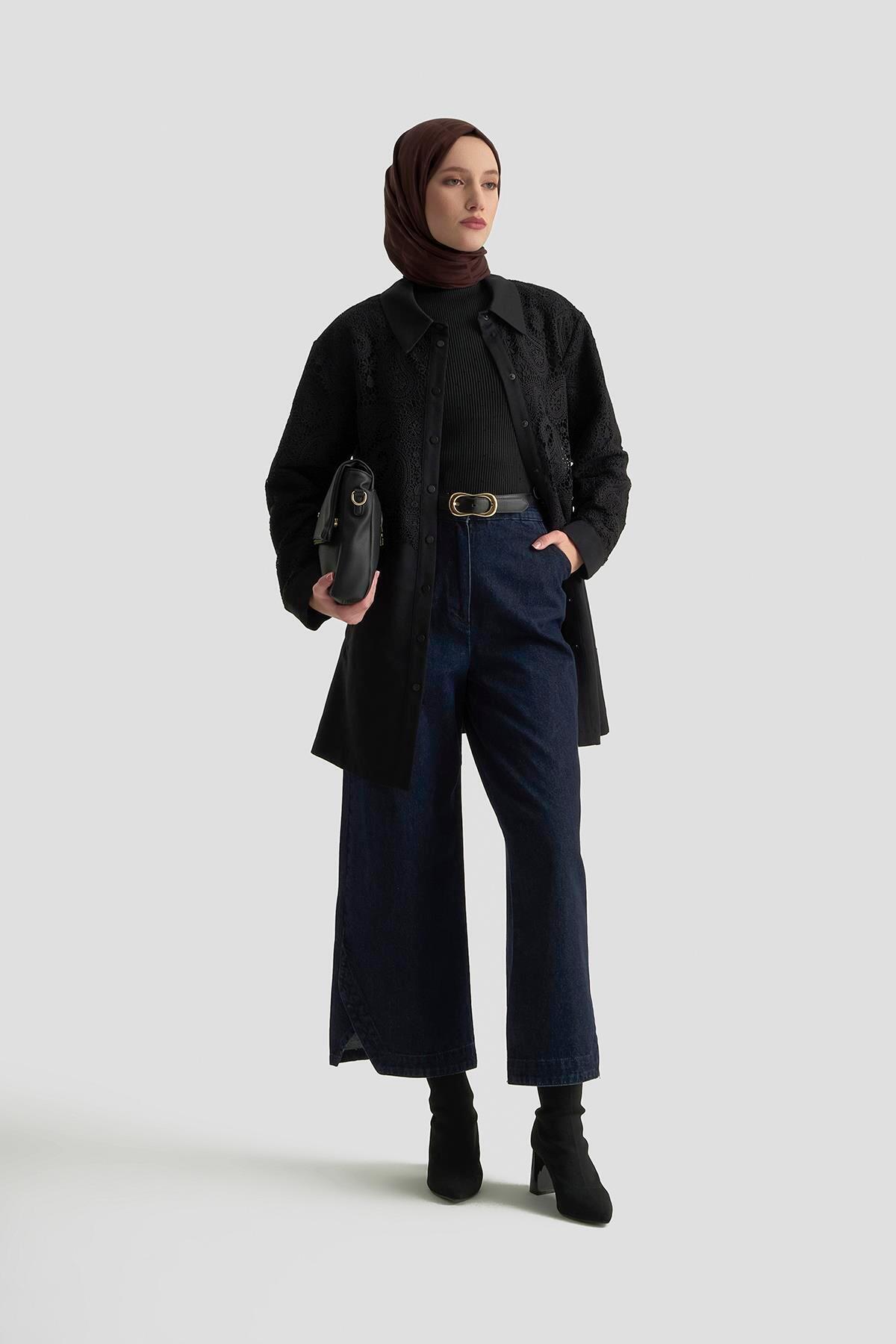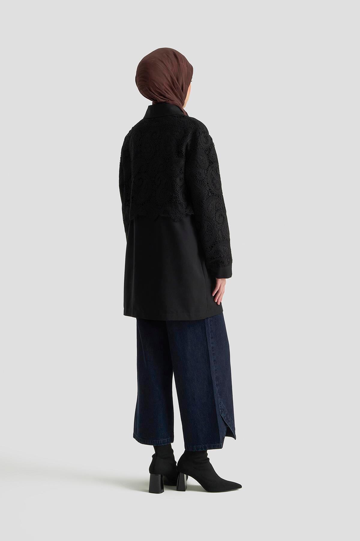 Dantel Allerli Kap 25K7924 Siyah, tesettür modasının en sevilen parçalarından. Vücut hatlarını gizleyen rahat kesimi, yumuşak dokusu ve özenli dikişleriyle konfor ve şıklığı bir arada sunar. Düğün, nişan, bayram veya günlük kullanım için ideal. Armine güvencesiyle sunulmaktadır.