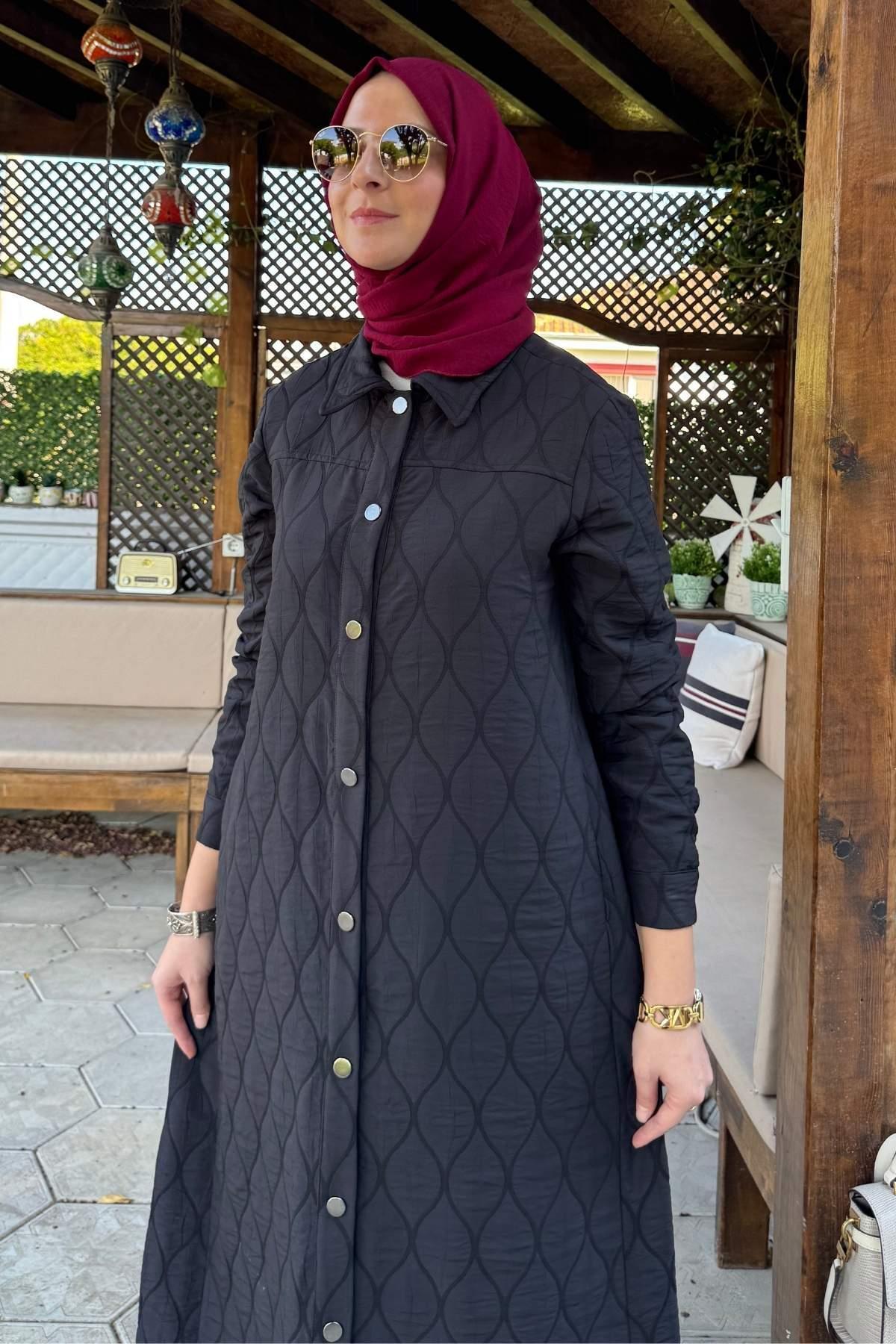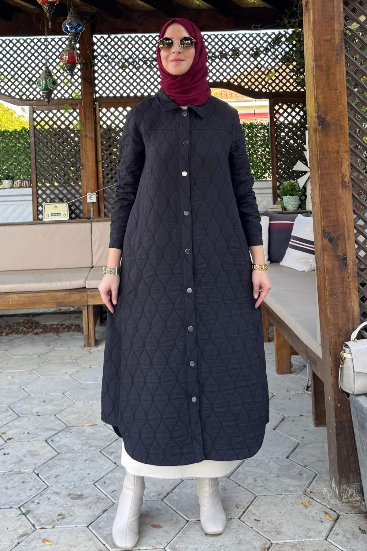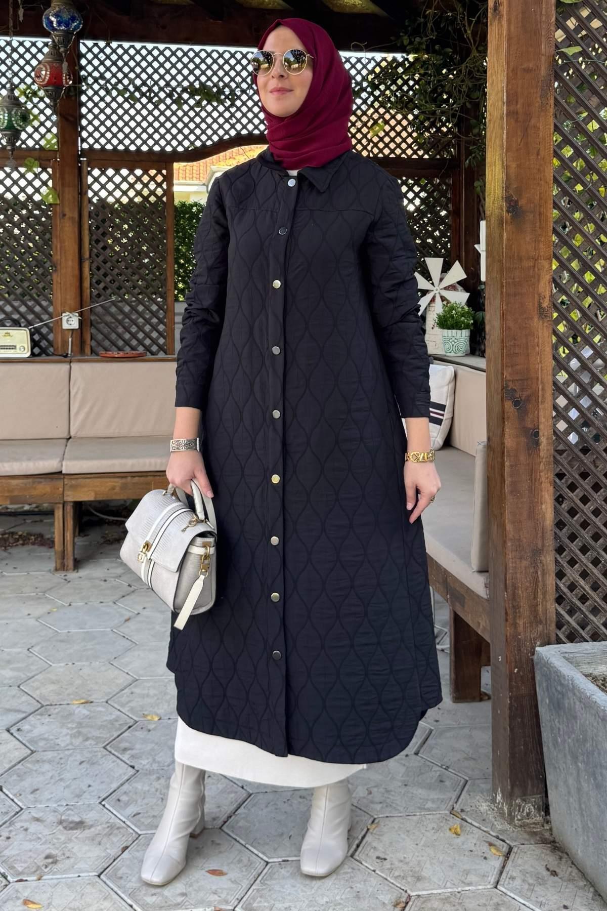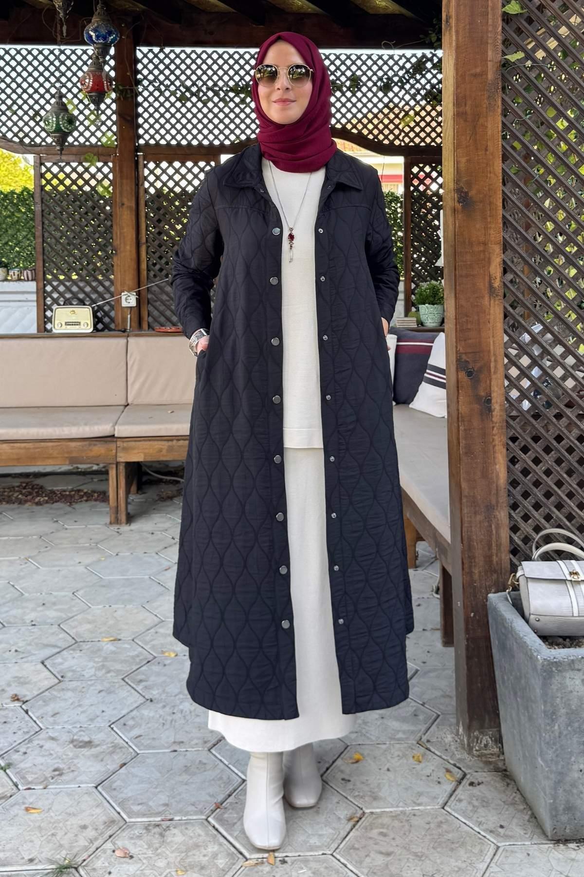Elmas Kapitone Kap Siyah, tesettür modasının en sevilen parçalarından. Vücut hatlarını gizleyen rahat kesimi, yumuşak dokusu ve özenli dikişleriyle konfor ve şıklığı bir arada sunar. Düğün, nişan, bayram veya günlük kullanım için ideal. Rabia Şamlı güvencesiyle sunulmaktadır.