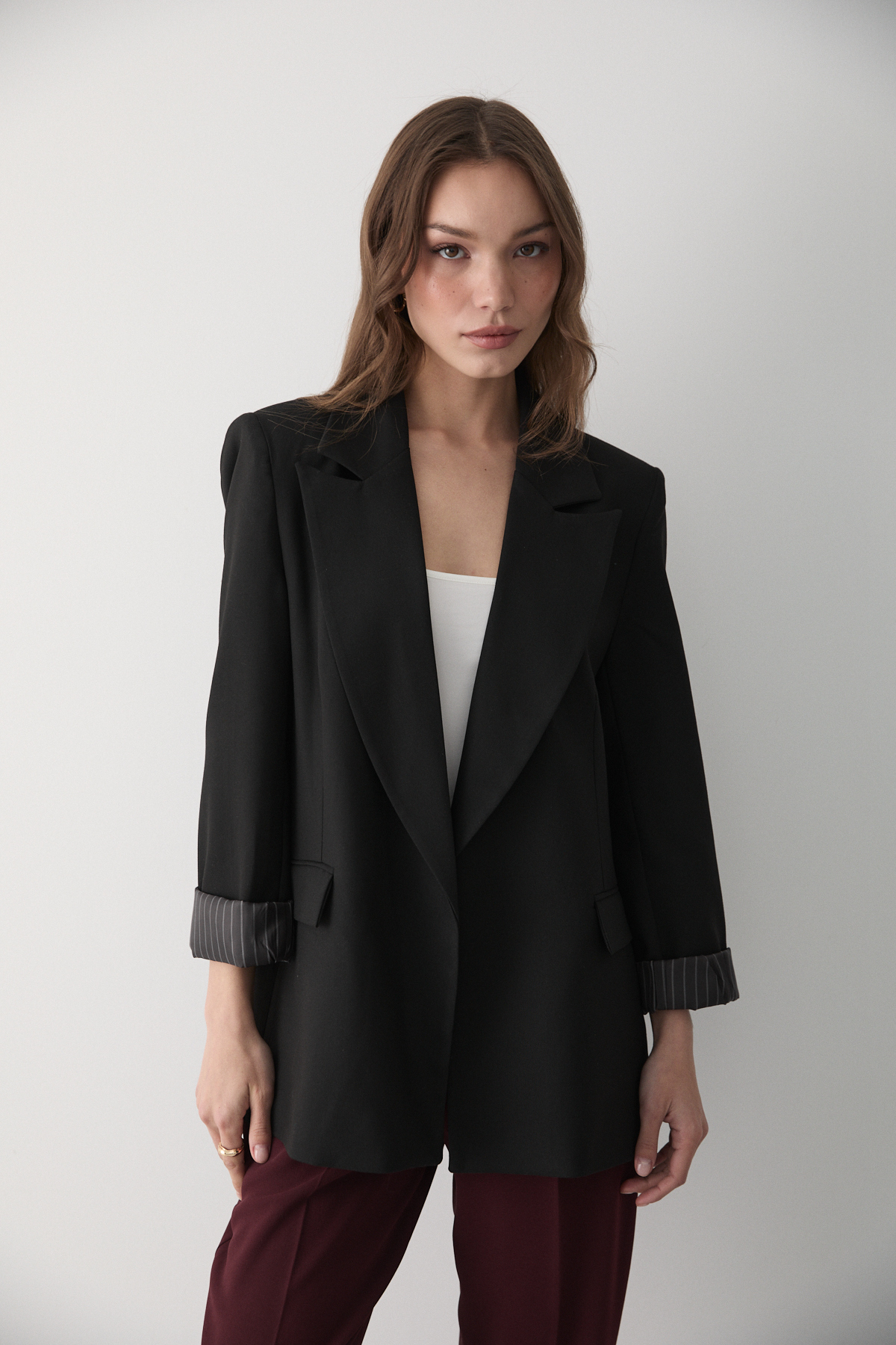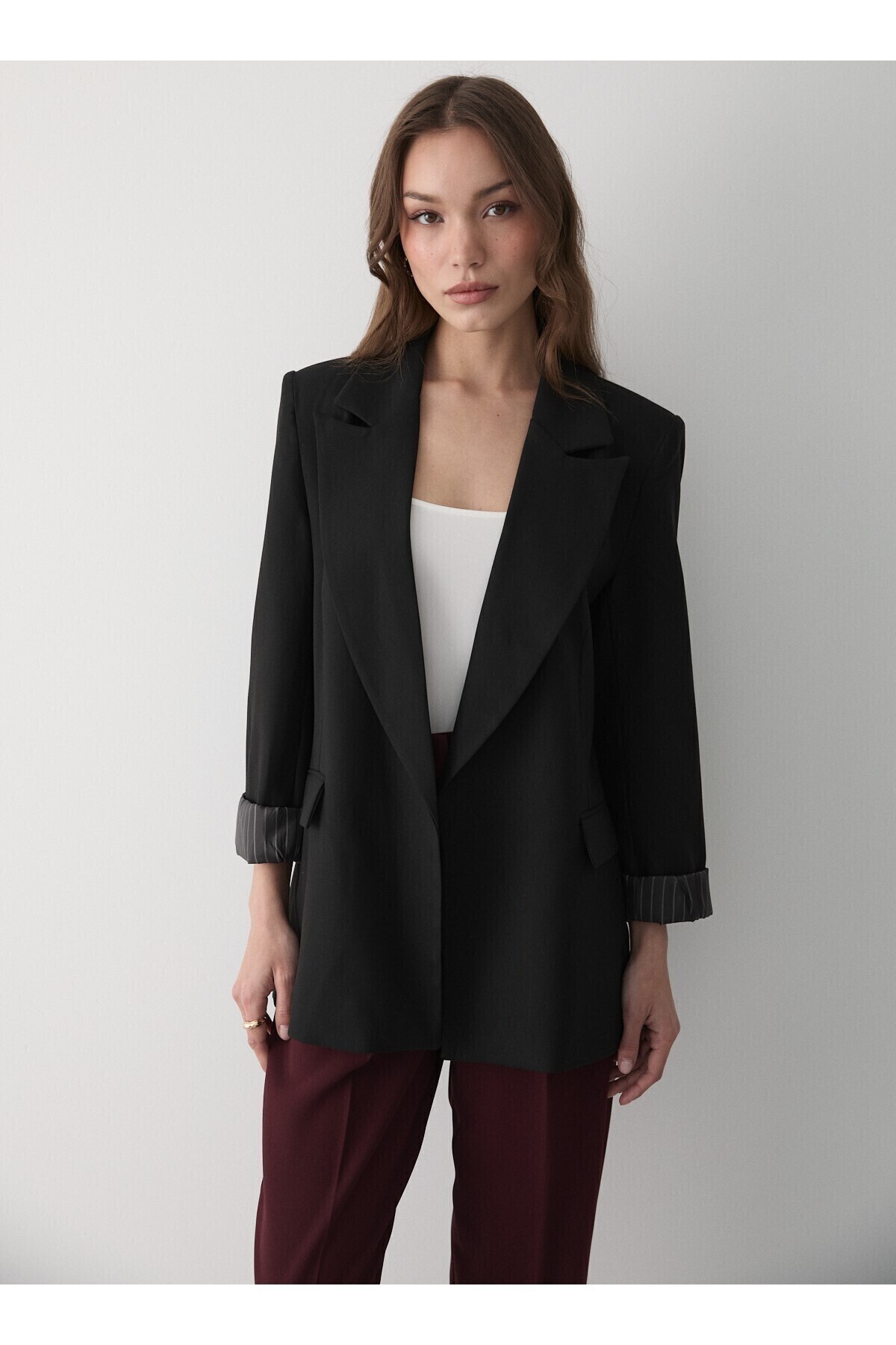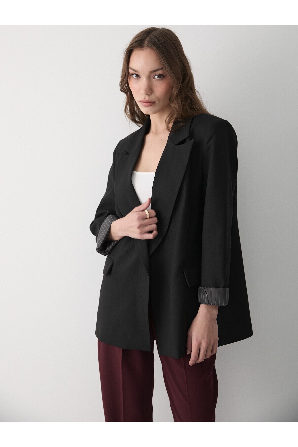 Kadın Siyah Çizgili İçi Astarlı Kol Detaylı Blazer Ceket, modern çizgileri ve sofistike detaylarıyla gardırobunuzun vazgeçilmezi olacak. Özenle seçilmiş kumaşı vücutta rahat durur ve hareket özgürlüğü sağlar. Farklı kombinlerle hem günlük hem de davet stilinizi oluşturabilirsiniz. JASTE güvencesiyle sunulmaktadır.