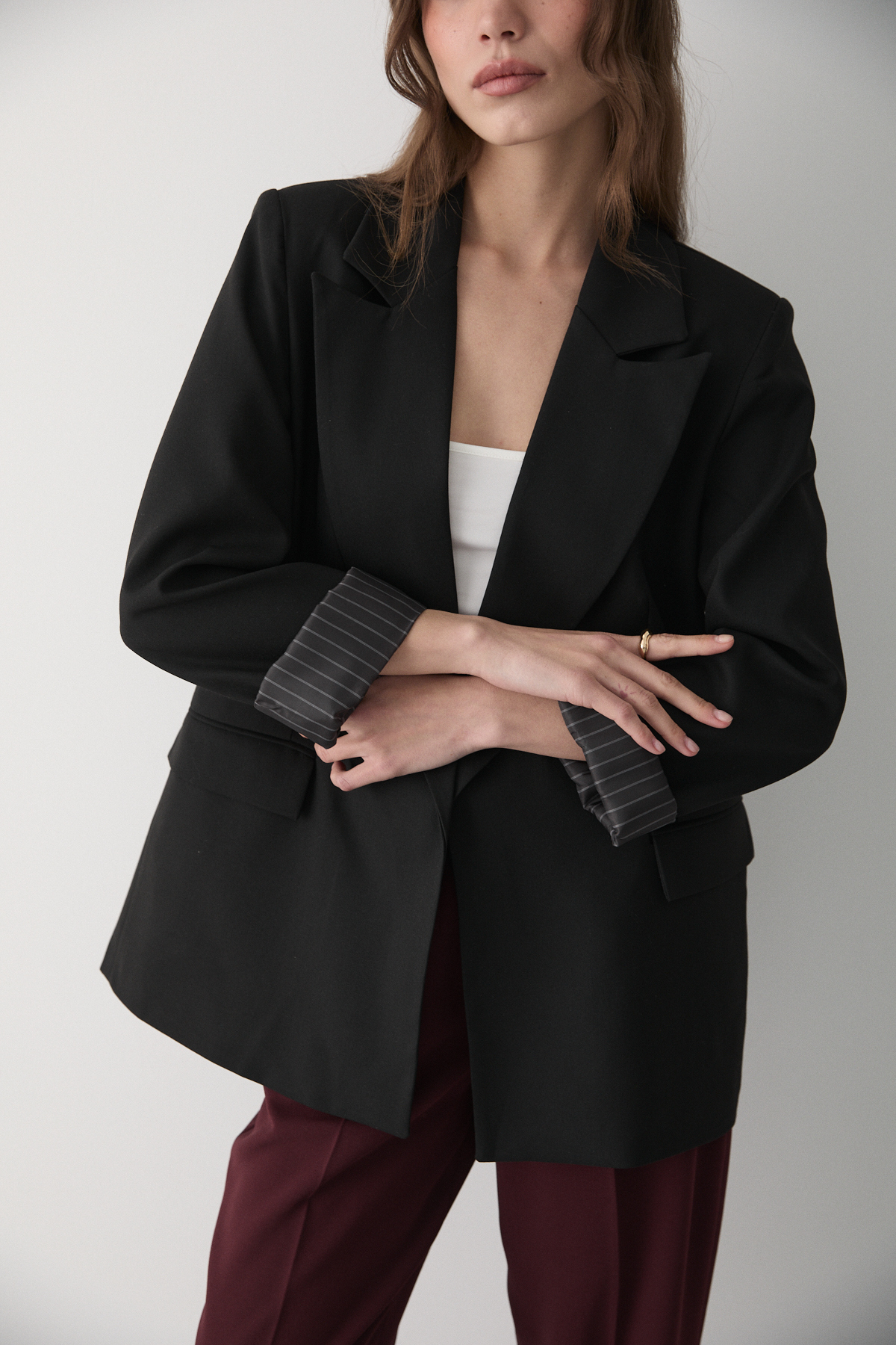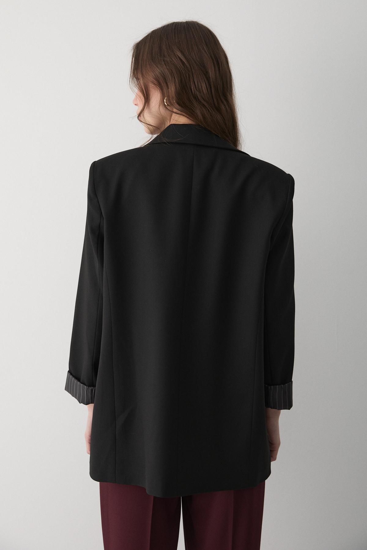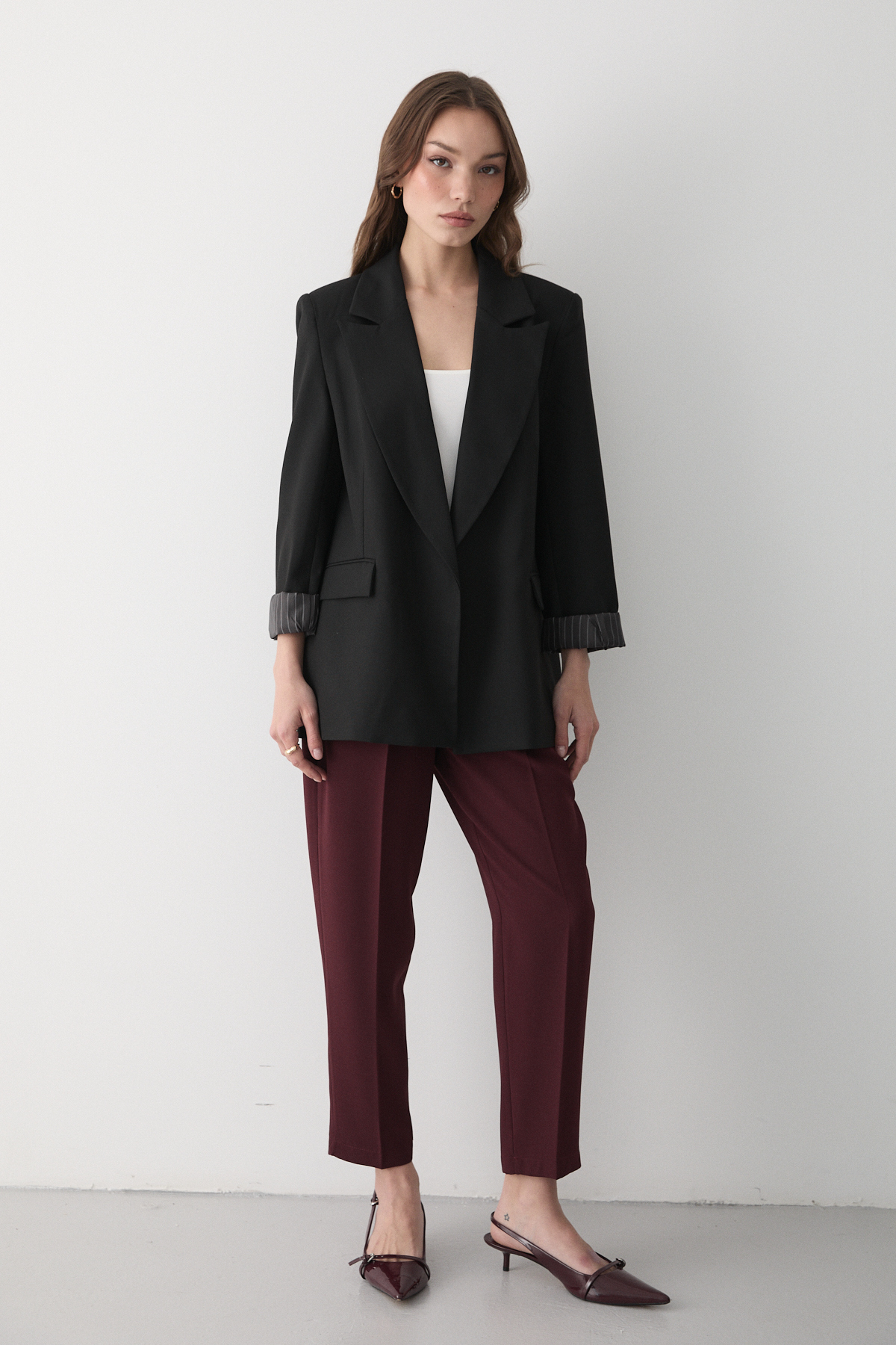 Kadın Siyah Çizgili İçi Astarlı Kol Detaylı Blazer Ceket, modern çizgileri ve sofistike detaylarıyla gardırobunuzun vazgeçilmezi olacak. Özenle seçilmiş kumaşı vücutta rahat durur ve hareket özgürlüğü sağlar. Farklı kombinlerle hem günlük hem de davet stilinizi oluşturabilirsiniz. JASTE güvencesiyle sunulmaktadır.