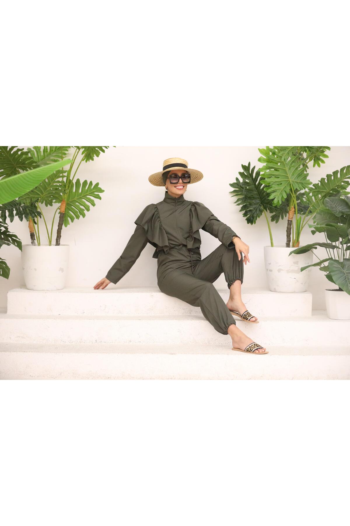 Omuzu Farbelalı Haki Tasarım Tesettür Paraşüt Kumaş Tulum Mayo, özel dikim teknikleriyle üretilmiş, kalitesini her detayda hissedebileceğiniz bir tasarım. Nefes alan kumaş yapısıyla mevsim geçişlerinde ideal bir tercih. Zarif silueti ve ince işçiliğiyle fark yaratacaksınız. NS TASARIM MAYO güvencesiyle sunulmaktadır.