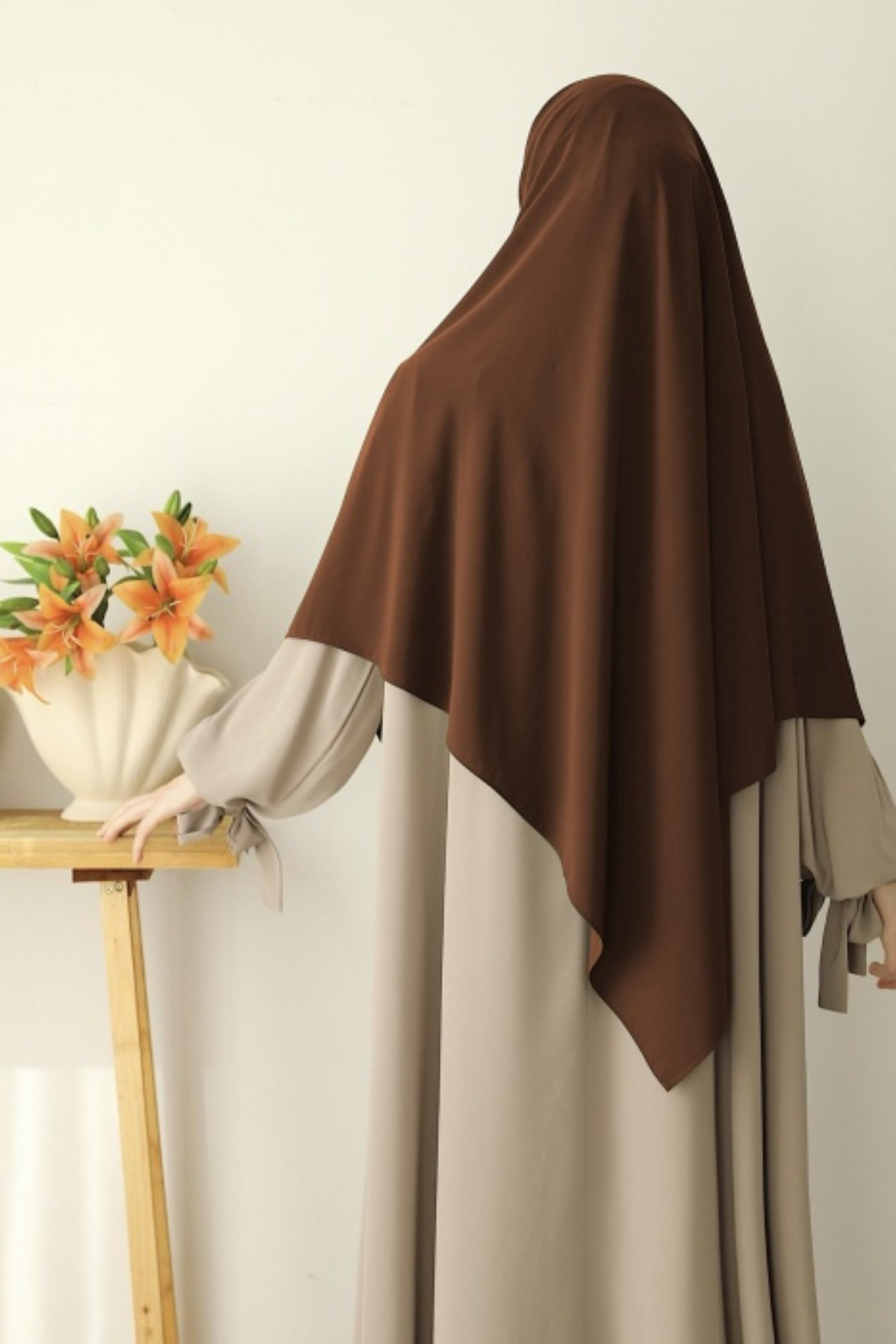 rengi çok güzel tam acı kahve,ama kumaşı kaliteli bir Medine ipeği değil