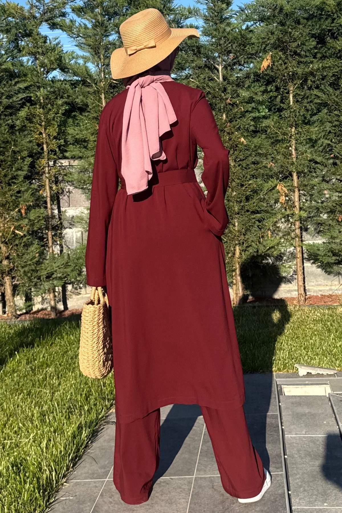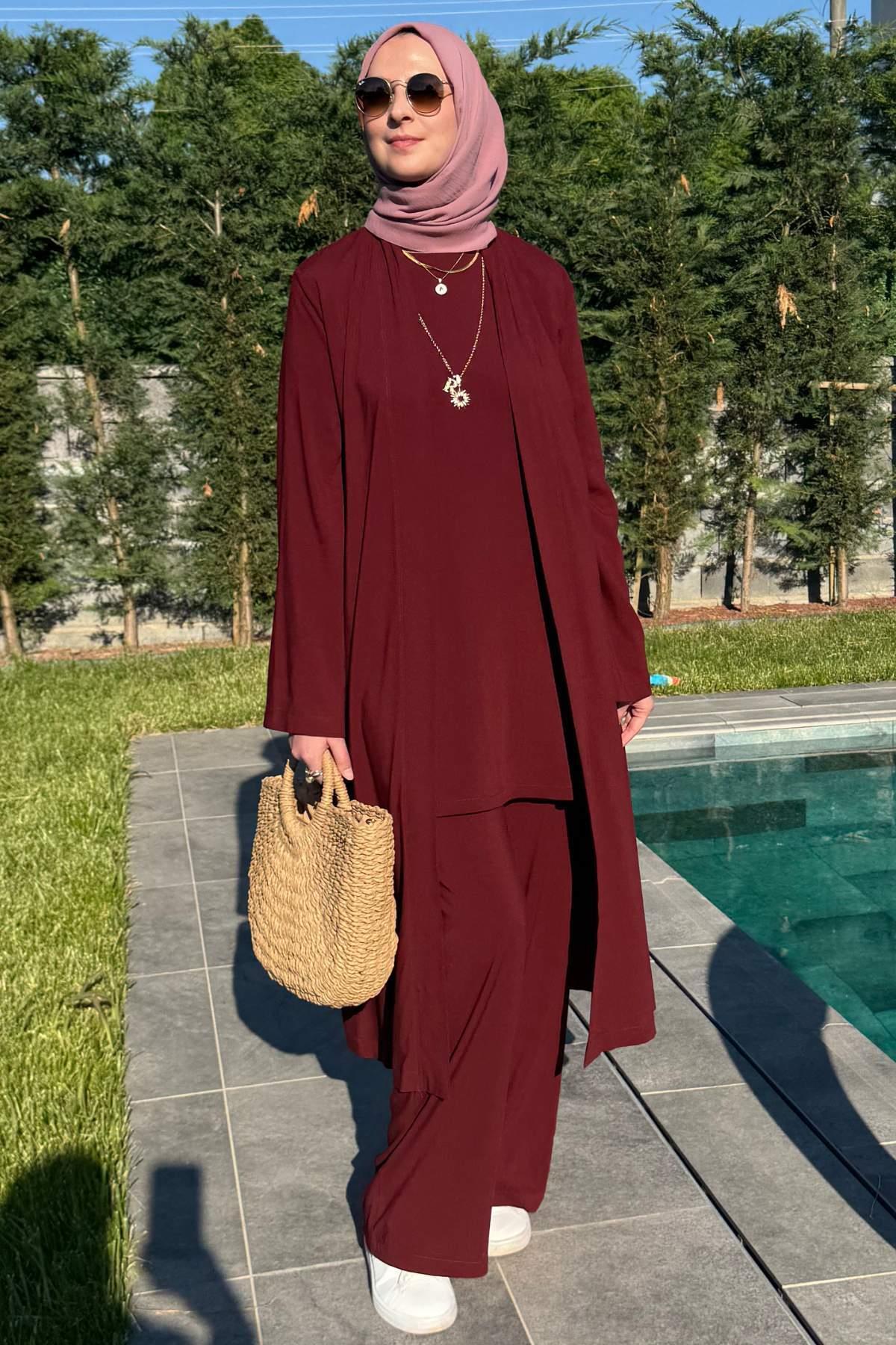 Yaren Üçlü Takım Bordo, zarif tasarımı ve kaliteli kumaşıyla günlük ve özel günlerinizde şıklığınızı tamamlayacak bir parça. Rahat kalıbı sayesinde gün boyu konforlu bir kullanım sunar. Tesettüre uygun kesimi ile her yaştan kadının tercih edebileceği bir model. Rabia Şamlı kalite güvencesiyle sizlere sunulmaktadır.