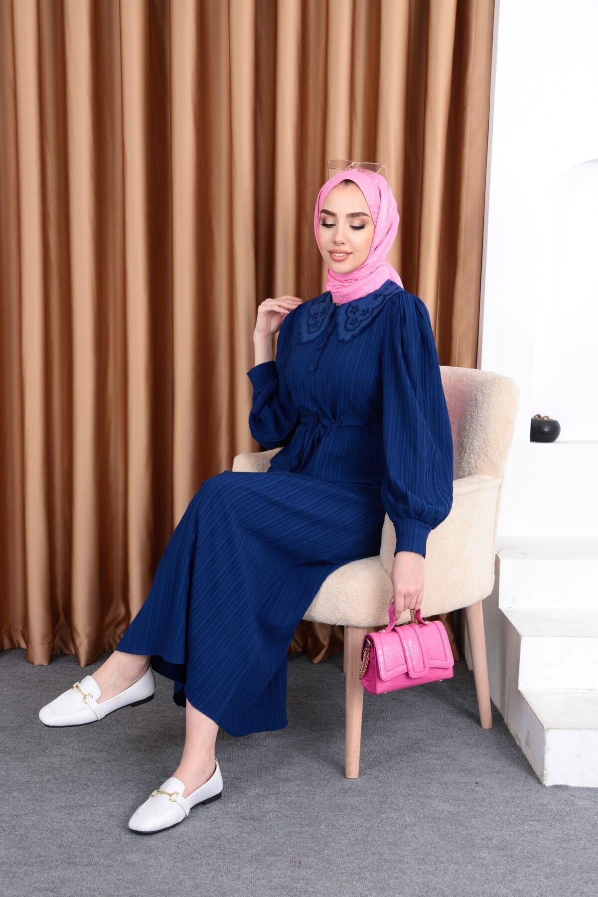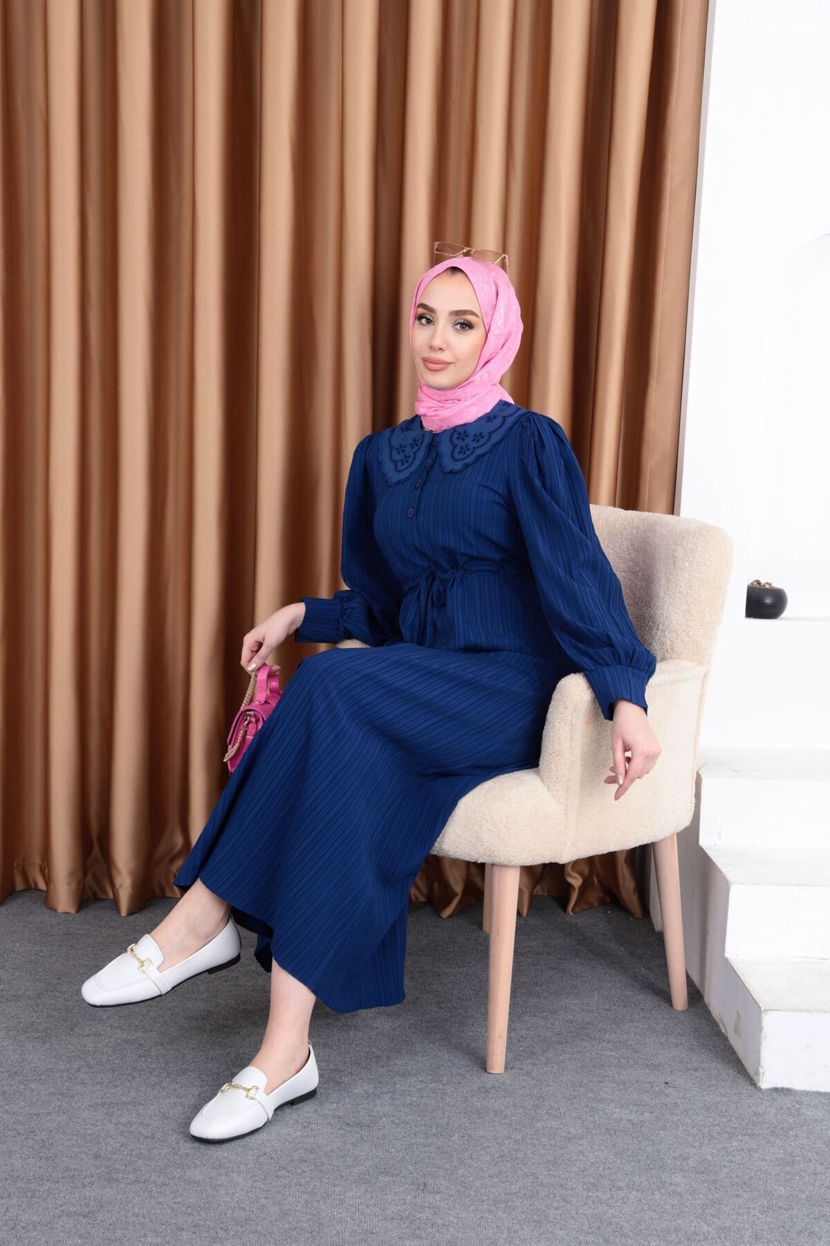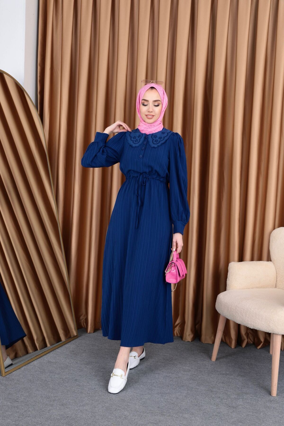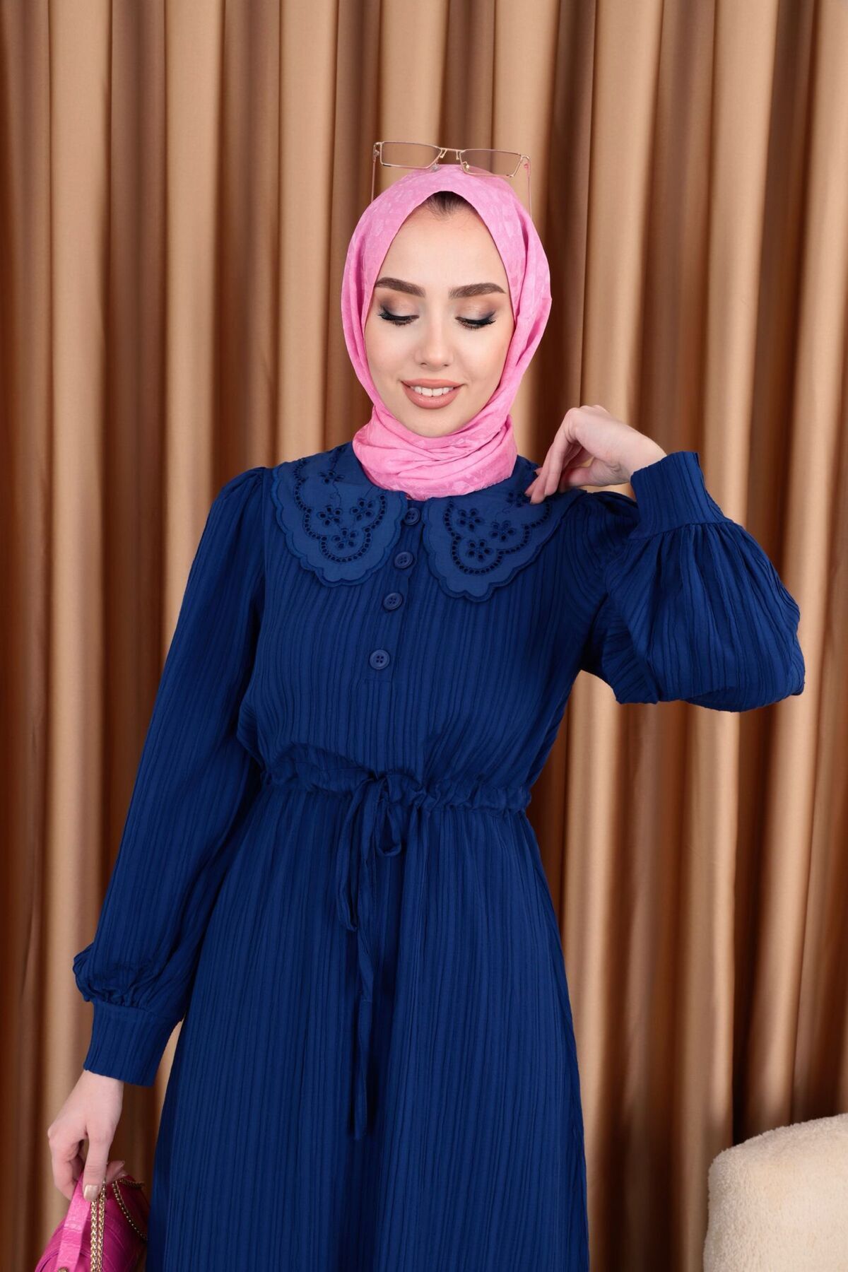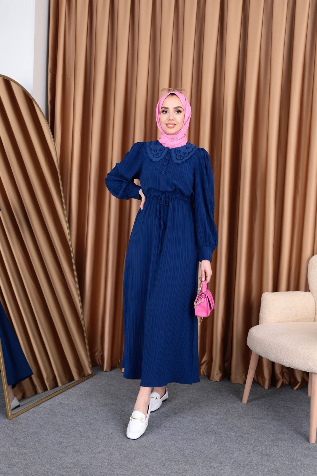 Elbise kumaş olarak tok ve kaliteli. Elbiseyi ufak dokunuşlarla farklılaştırıp kullanmayı tercih ettik:)