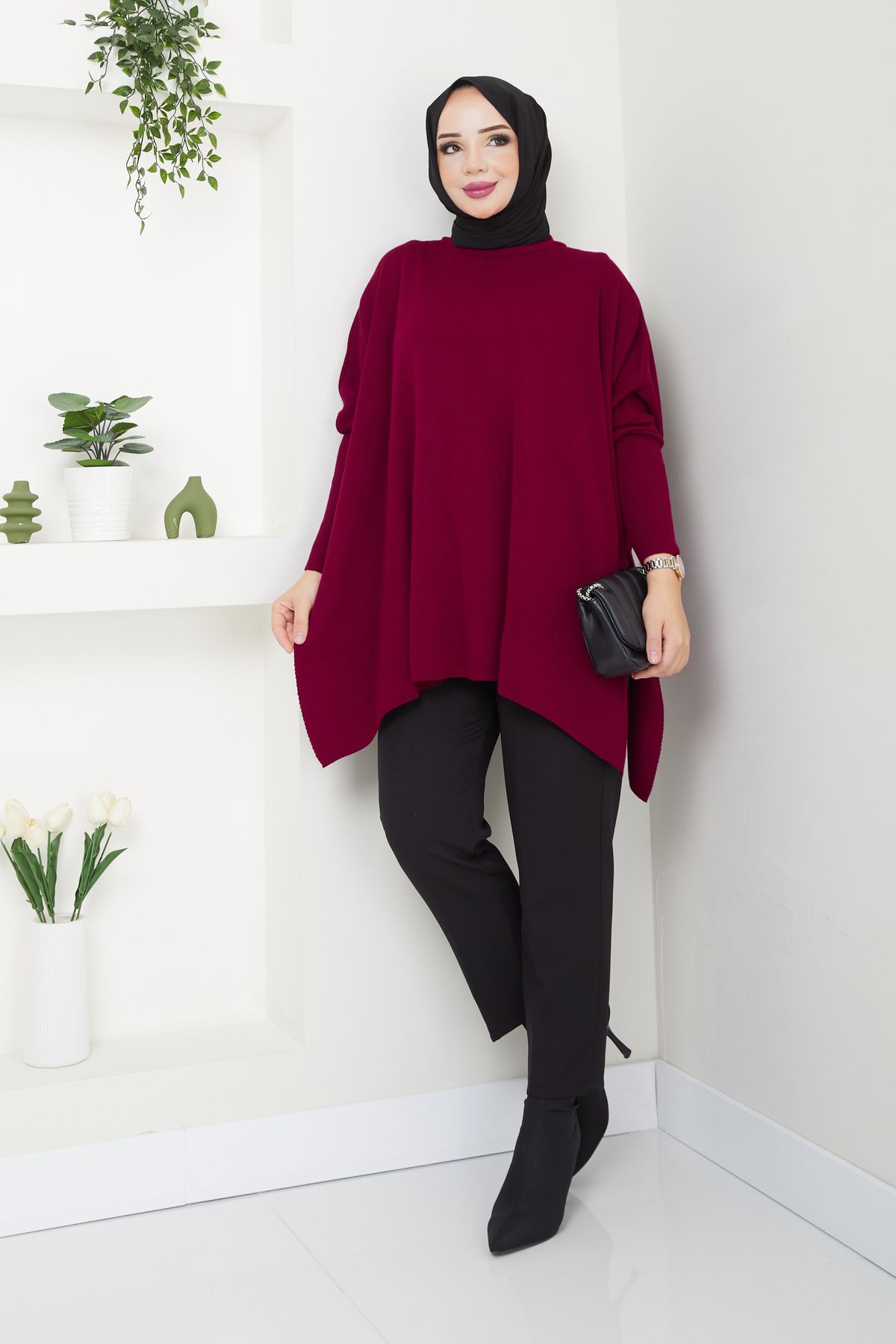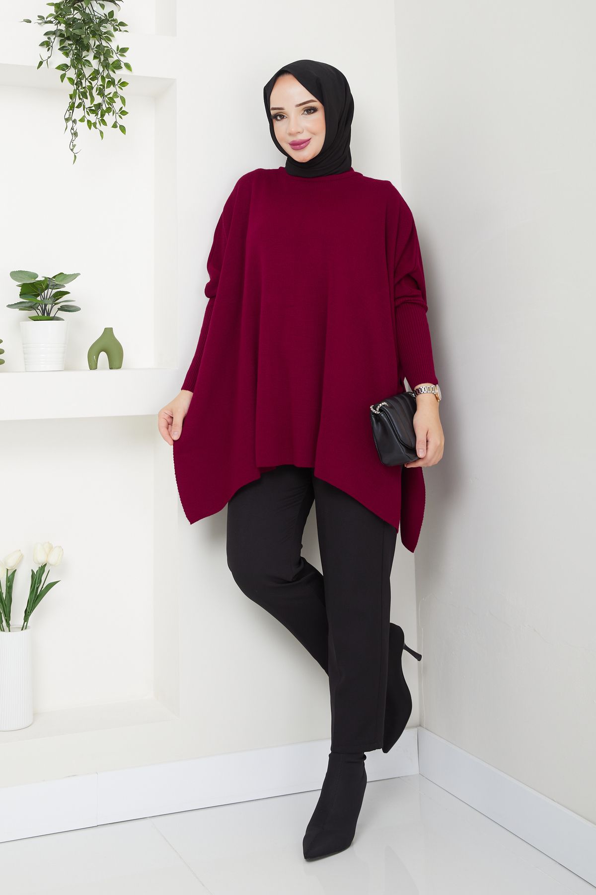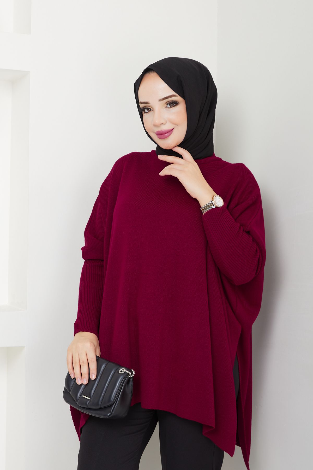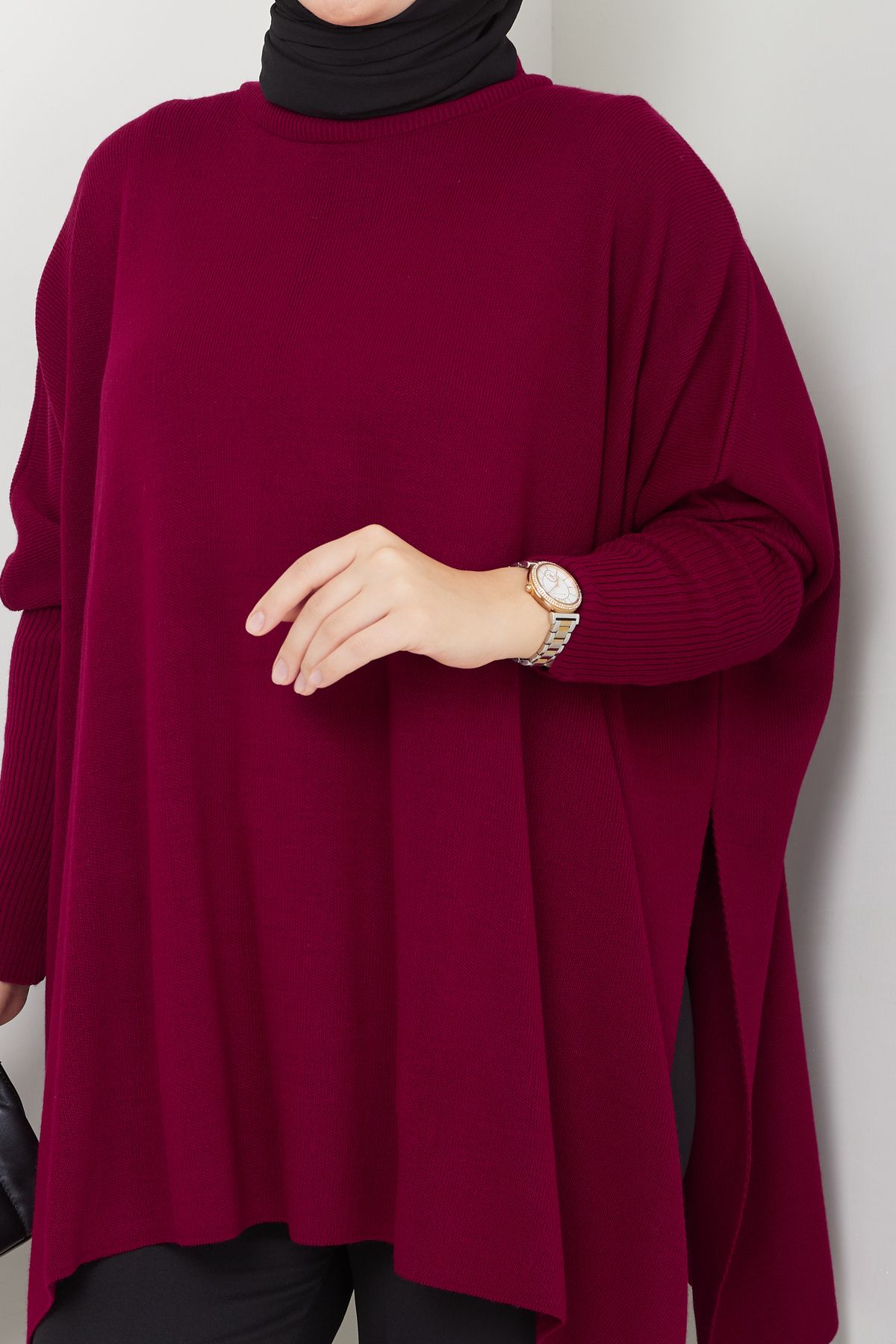Kadın Bordo Tesettür Triko Oversize Yırtmaçlı Kazak, tesettür modasının en sevilen parçalarından. Vücut hatlarını gizleyen rahat kesimi, yumuşak dokusu ve özenli dikişleriyle konfor ve şıklığı bir arada sunar. Düğün, nişan, bayram veya günlük kullanım için ideal. LE CARAMBOLE güvencesiyle sunulmaktadır.
