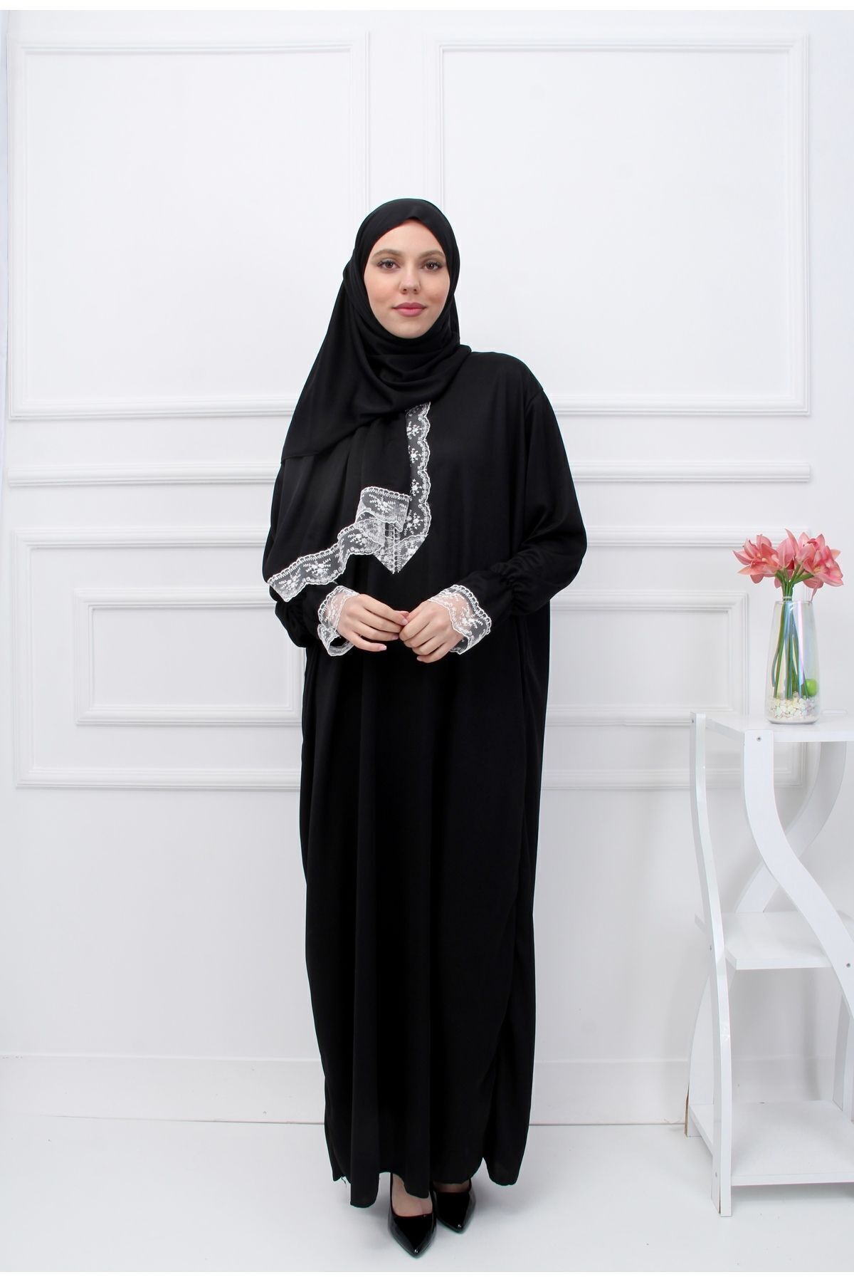 Kadın Mevsimlik Tek Parça Kendinden Başörtülü Dantelli Terletmeyen Dökümlü Ferace Namaz Elbisesi, modern çizgileri ve sofistike detaylarıyla gardırobunuzun vazgeçilmezi olacak. Özenle seçilmiş kumaşı vücutta rahat durur ve hareket özgürlüğü sağlar. Farklı kombinlerle hem günlük hem de davet stilinizi oluşturabilirsiniz. Kutay Collection güvencesiyle sunulmaktadır.