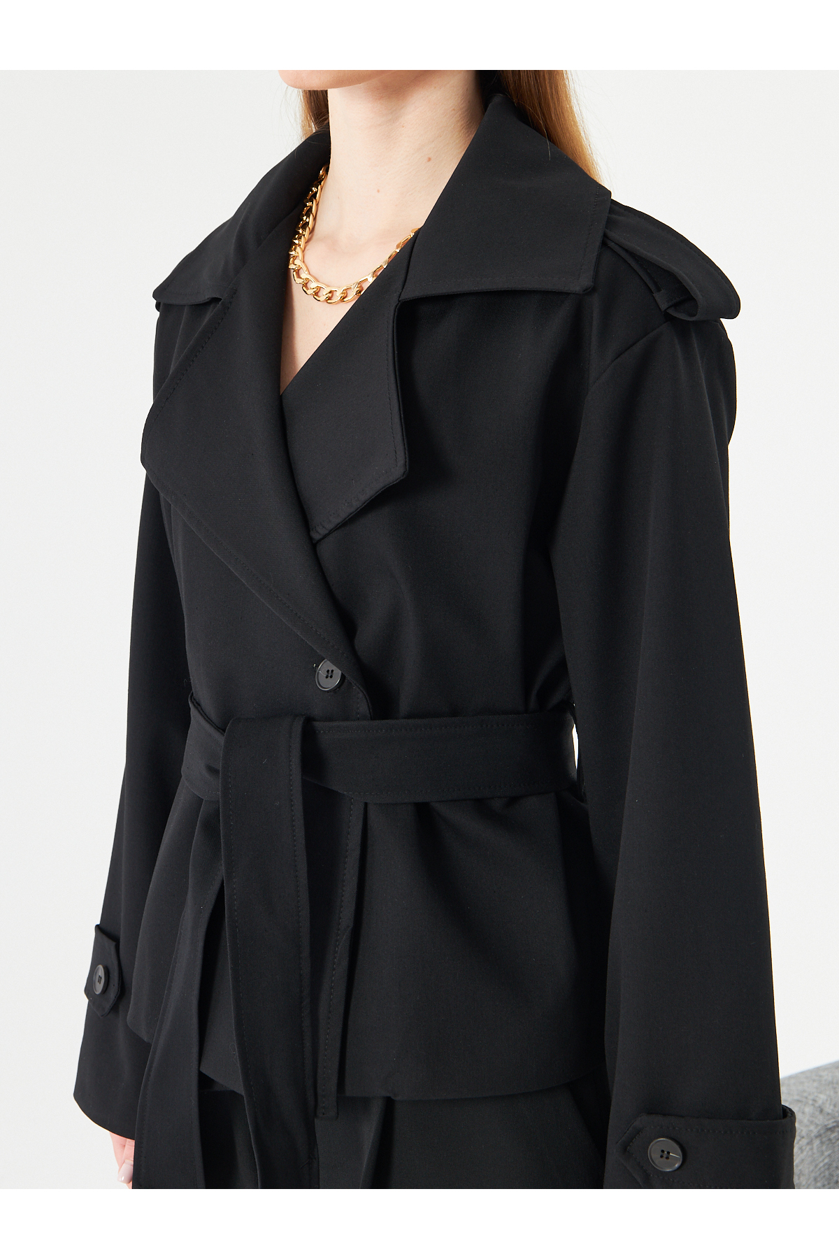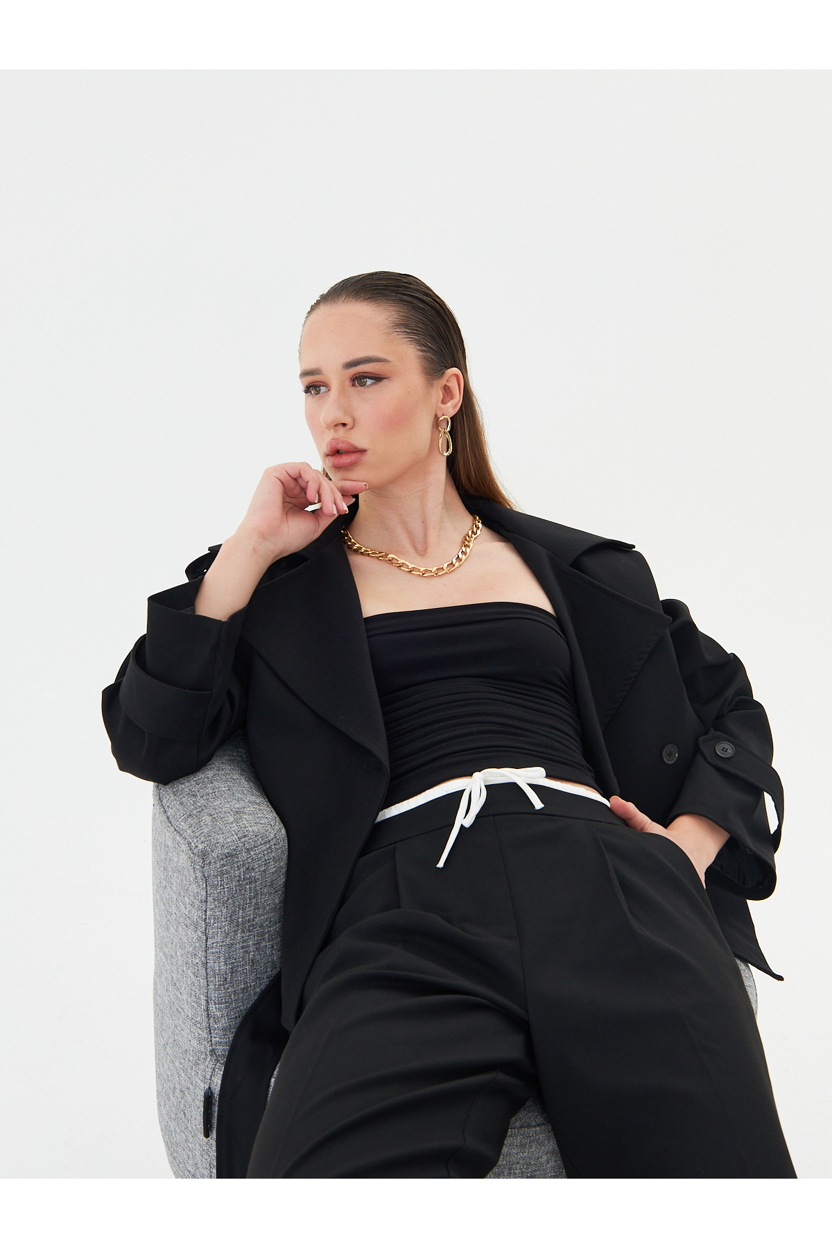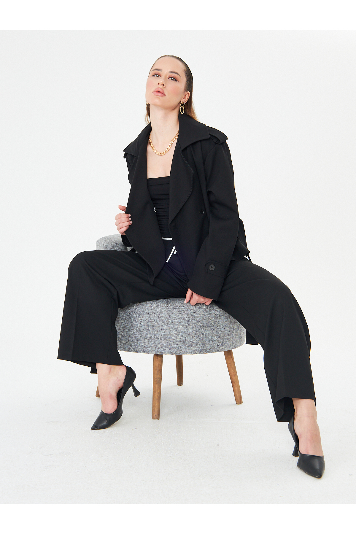 Kadın Trençkot Kısa Kadın Trençkot Siyah Astarlı Tesettür Trençkot Belden Bağlamalı Önden Bağlamalı, modern çizgileri ve sofistike detaylarıyla gardırobunuzun vazgeçilmezi olacak. Özenle seçilmiş kumaşı vücutta rahat durur ve hareket özgürlüğü sağlar. Farklı kombinlerle hem günlük hem de davet stilinizi oluşturabilirsiniz. LA PANTE güvencesiyle sunulmaktadır.