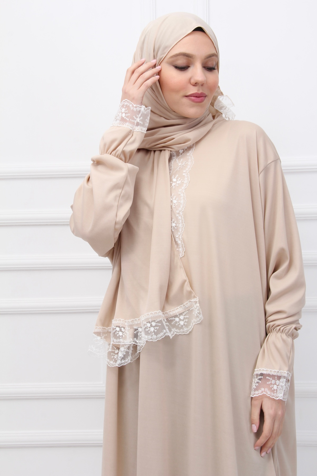 Kendinden Başörtülü Şık Dantelli Kadın Tesettür Namaz Elbisesi, modern çizgileri ve şık detaylarıyla gardırobunuzun vazgeçilmezi olacak. Mevsimin en trend renklerinde sunulan bu ürün, farklı kombinlerle kullanılabilir. Kaliteli dikimi ve dayanıklı kumaşıyla uzun süre yeni görünümünü korur. Defka kalite güvencesiyle sizlere sunulmaktadır.