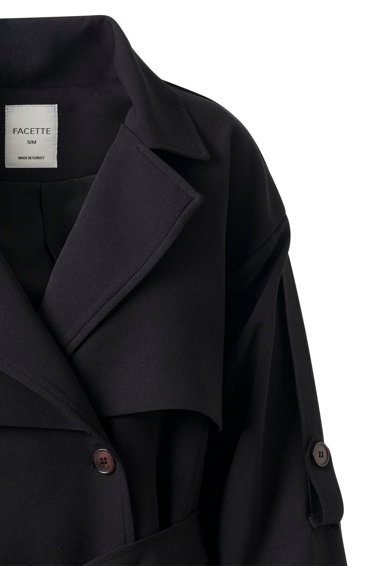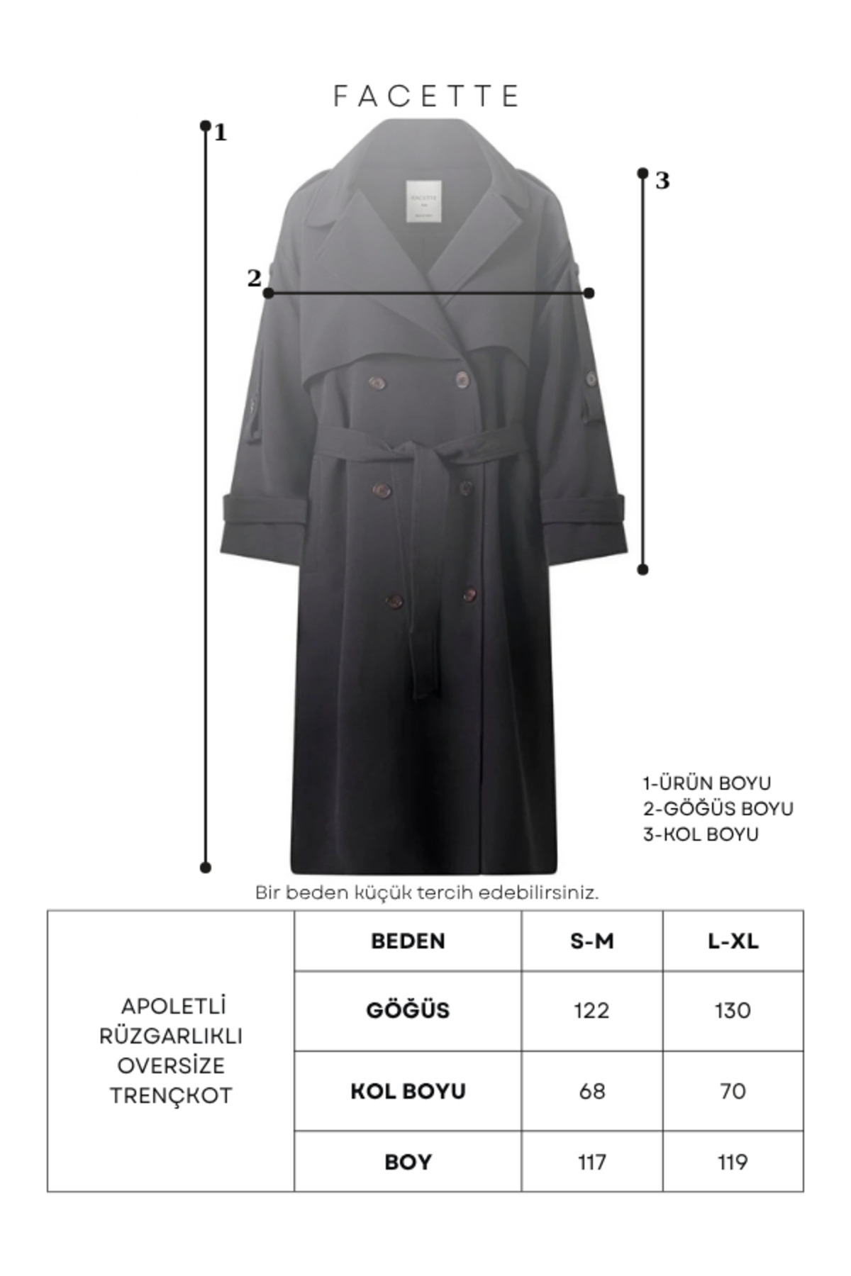 Kol Apoletli Rüzgarlıklı Oversize Trençkot Siyah, tesettür modasının en sevilen parçalarından. Vücut hatlarını gizleyen rahat kesimi, yumuşak dokusu ve özenli dikişleriyle konfor ve şıklığı bir arada sunar. Düğün, nişan, bayram veya günlük kullanım için ideal. FACETTE güvencesiyle sunulmaktadır.