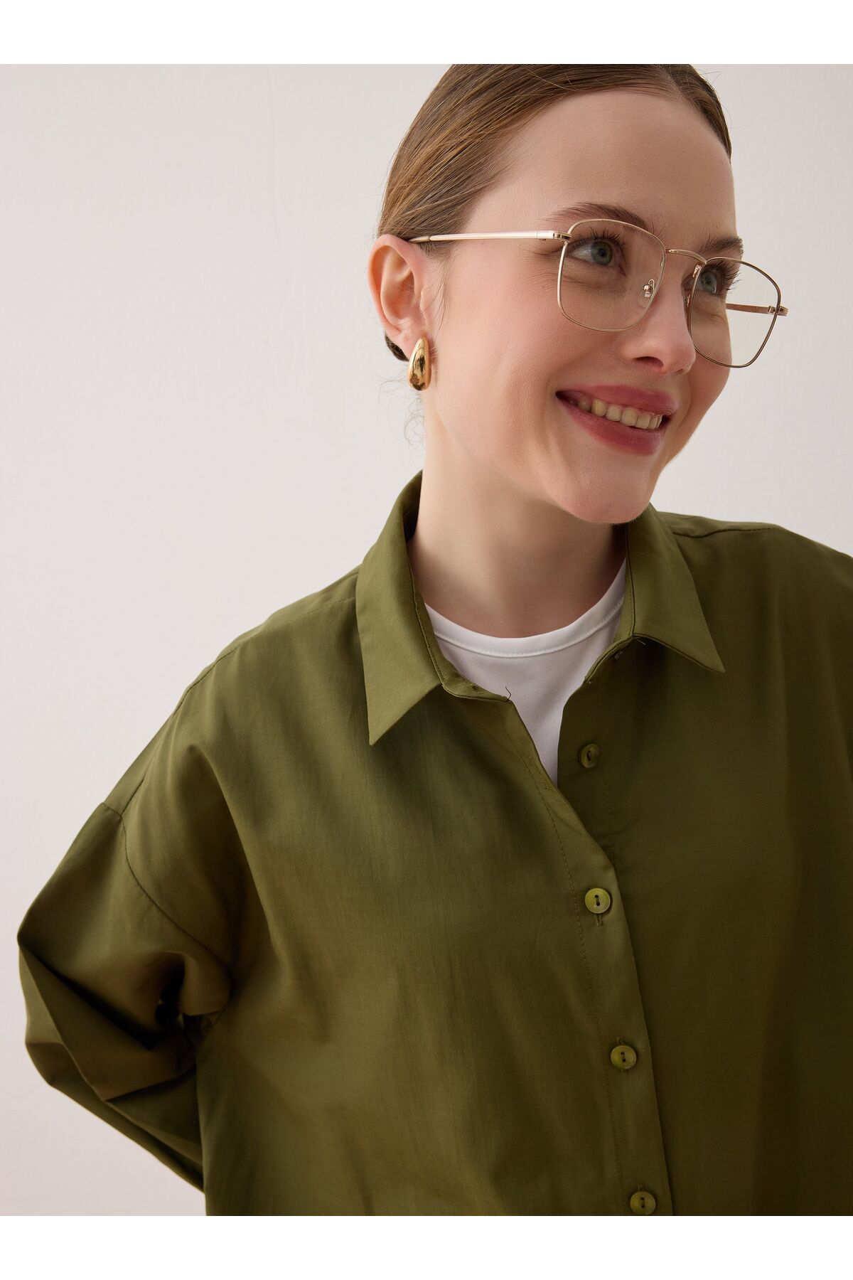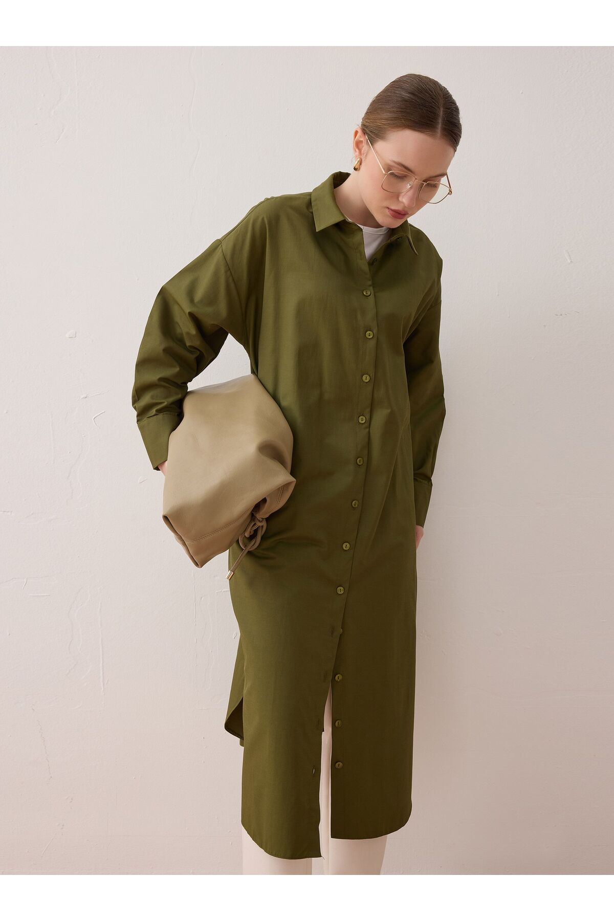 Poplin Kumaşlı Uzun Basic Gömlek - Haki -