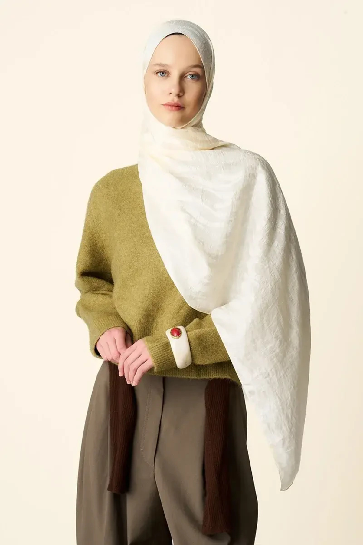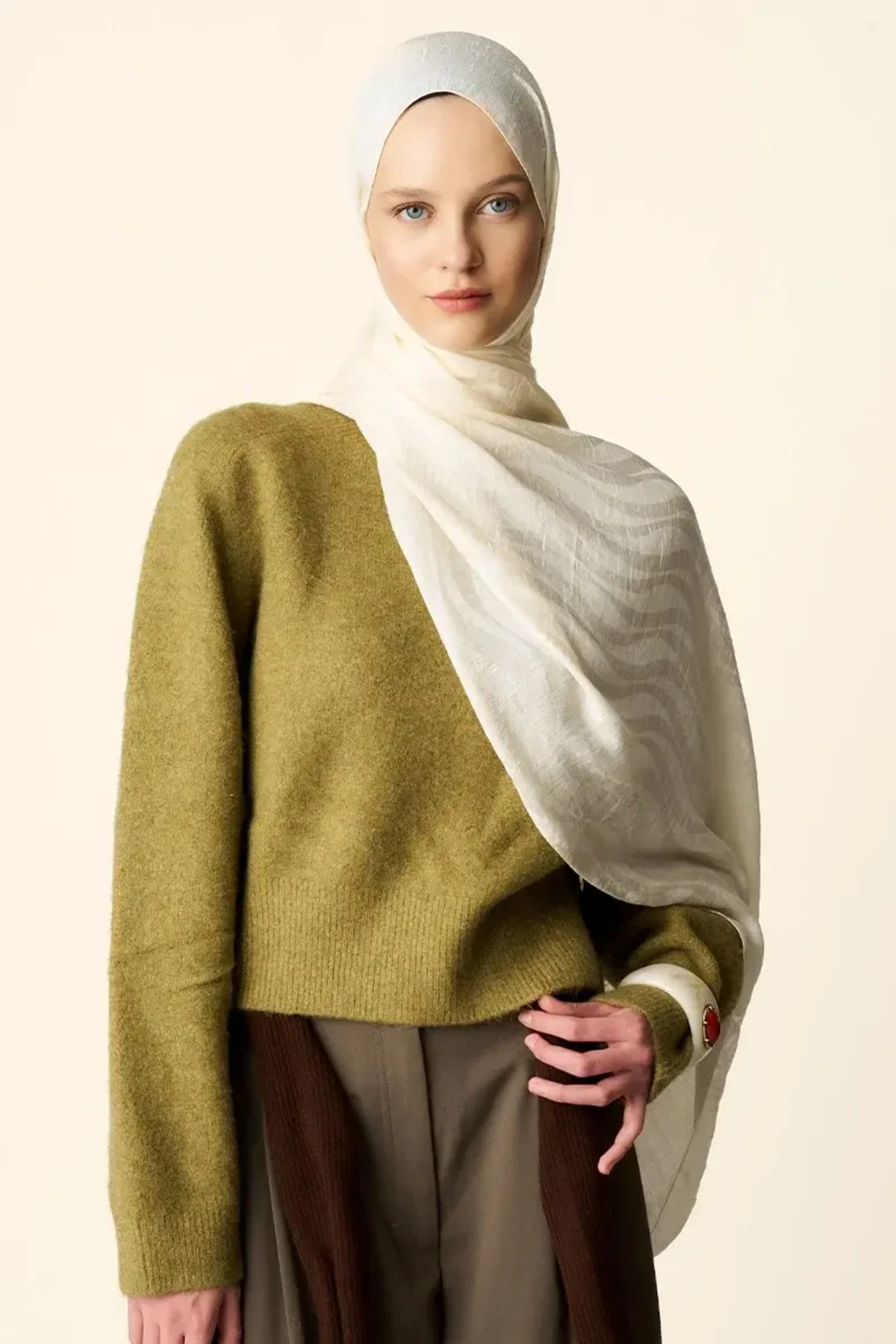 Premium Jakar Şal Dalga Desen - Krem, özel dokuma tekniğiyle üretilmiş, kalitesini hissedeceğiniz bir şal. Hafif yapısıyla dört mevsim kullanıma uygun olup, farklı bağlama stillerinde harika görünüm sunar. Madame Polo güvencesiyle sunulmaktadır.