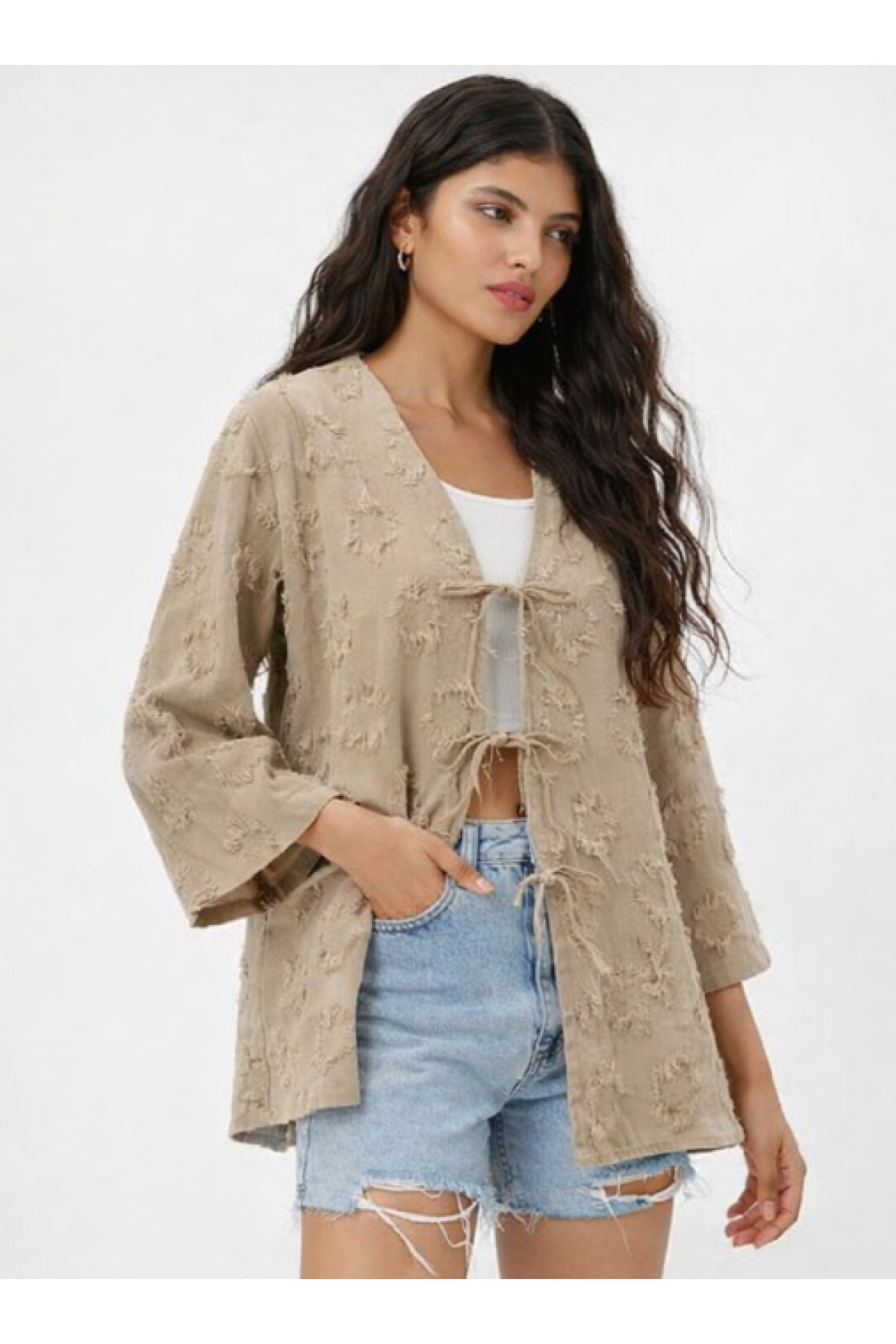 Püsküllü Bağlamalı Kadın Kesme Kimono Hırka, modern çizgileri ve sofistike detaylarıyla gardırobunuzun vazgeçilmezi olacak. Özenle seçilmiş kumaşı vücutta rahat durur ve hareket özgürlüğü sağlar. Farklı kombinlerle hem günlük hem de davet stilinizi oluşturabilirsiniz. HAKKE güvencesiyle sunulmaktadır.