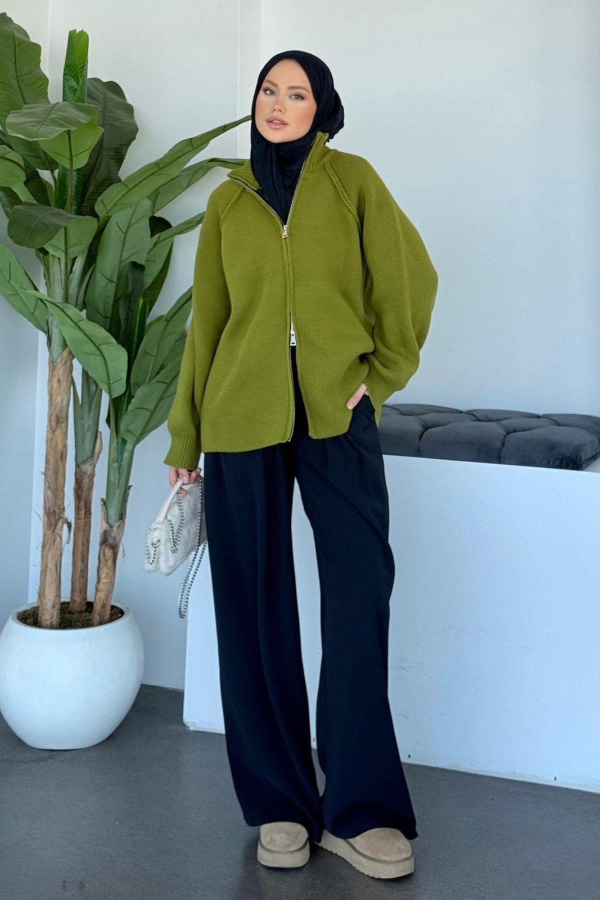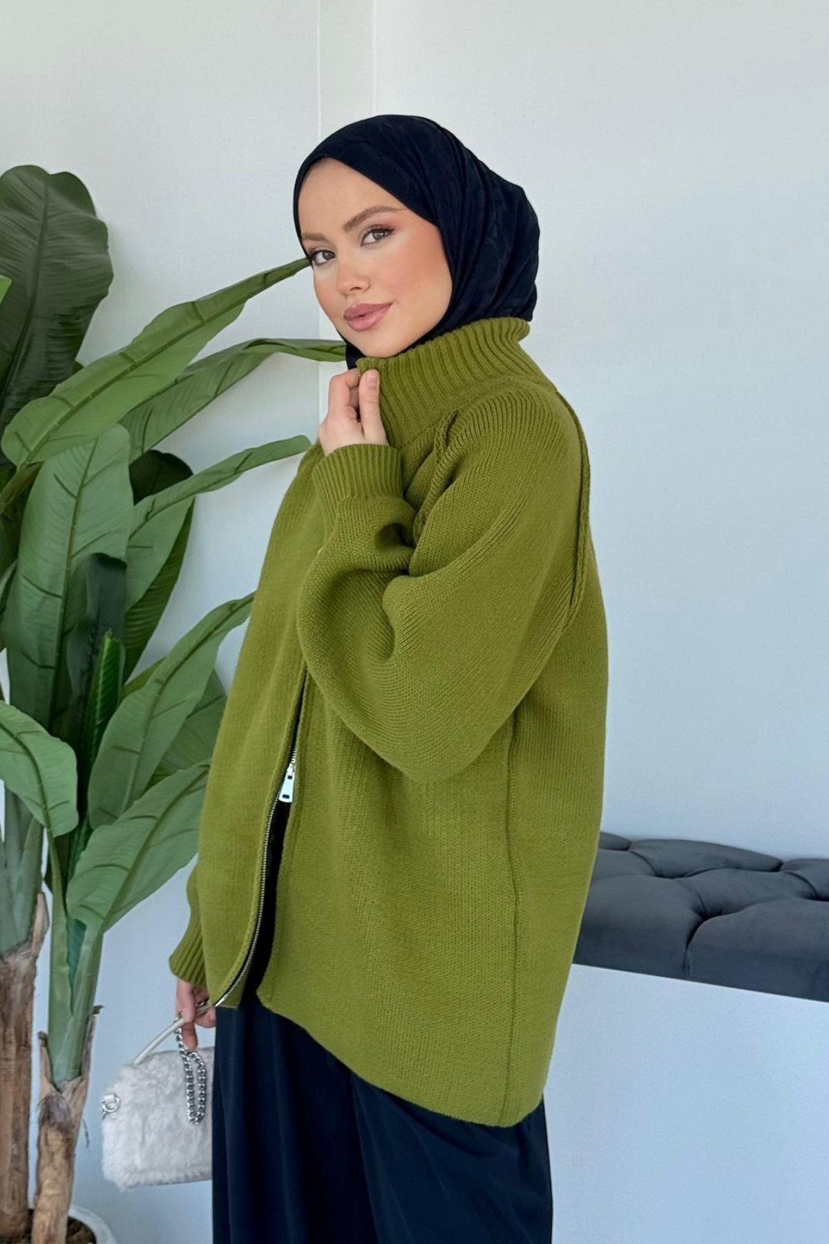 Roma Fermuarlı Hırka Yağ Yeşili, modern çizgileri ve sofistike detaylarıyla gardırobunuzun vazgeçilmezi olacak. Özenle seçilmiş kumaşı vücutta rahat durur ve hareket özgürlüğü sağlar. Farklı kombinlerle hem günlük hem de davet stilinizi oluşturabilirsiniz. Hazamoda güvencesiyle sunulmaktadır.