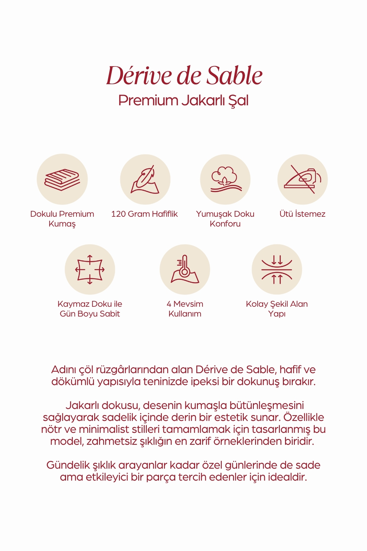 Sable Drift Premium Jakarlı Şal Bordo, zarif görünümü ve pratik kullanımıyla günlük hayatınızın vazgeçilmezi olacak. Kolay şekil alabilir yapısıyla farklı bağlama stillerinde kullanabilirsiniz. Yıkamaya dayanıklı kumaşıyla uzun ömürlü kullanım sunar. MOISCARF kalite güvencesiyle sizlere sunulmaktadır.