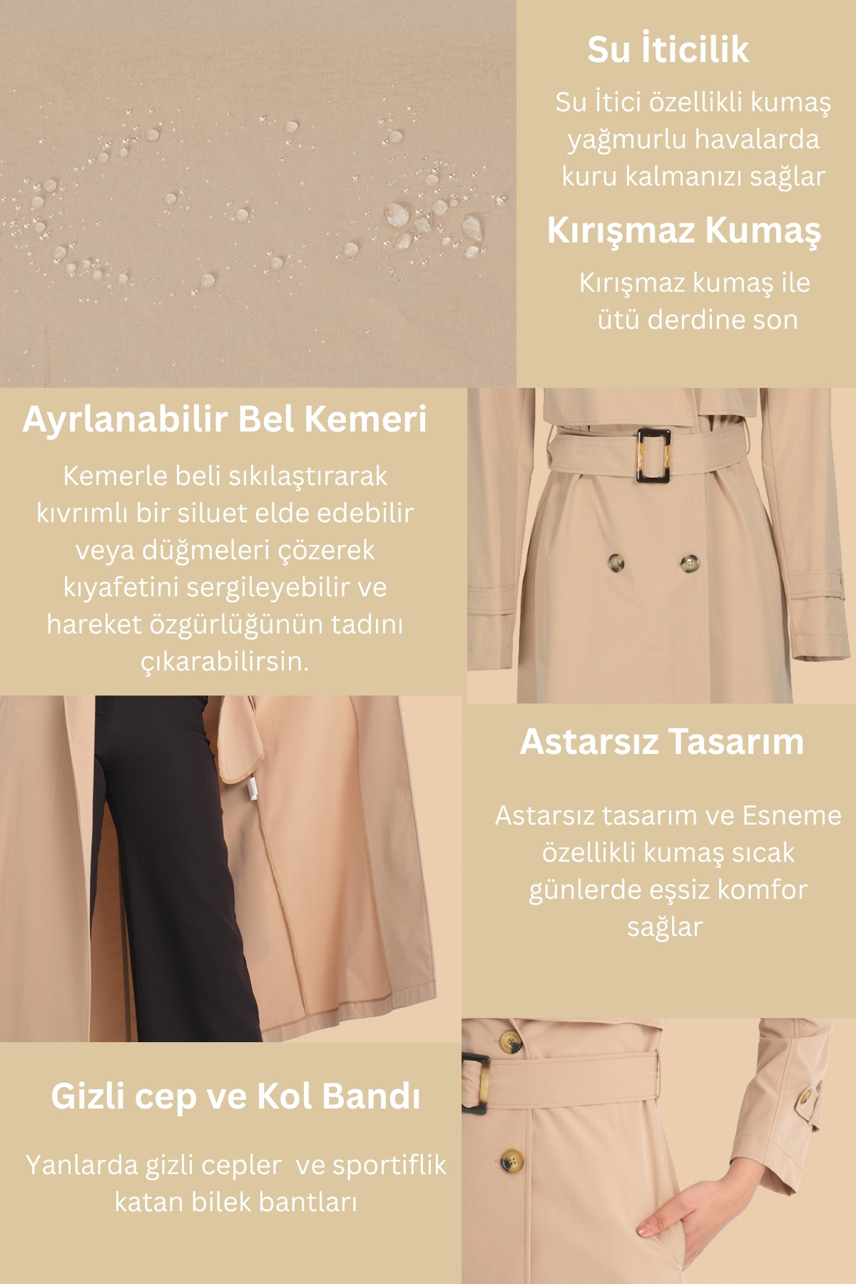 Soydan Su Itici Kırışmaz Esnek Astarsız Ara Boy Yazlık Trençkot Bej 7522, zarif tasarımı ve kaliteli kumaşıyla günlük ve özel günlerinizde şıklığınızı tamamlayacak bir parça. Rahat kalıbı sayesinde gün boyu konforlu bir kullanım sunar. Tesettüre uygun kesimi ile her yaştan kadının tercih edebileceği şık bir model. Nihle güvencesiyle sunulmaktadır.