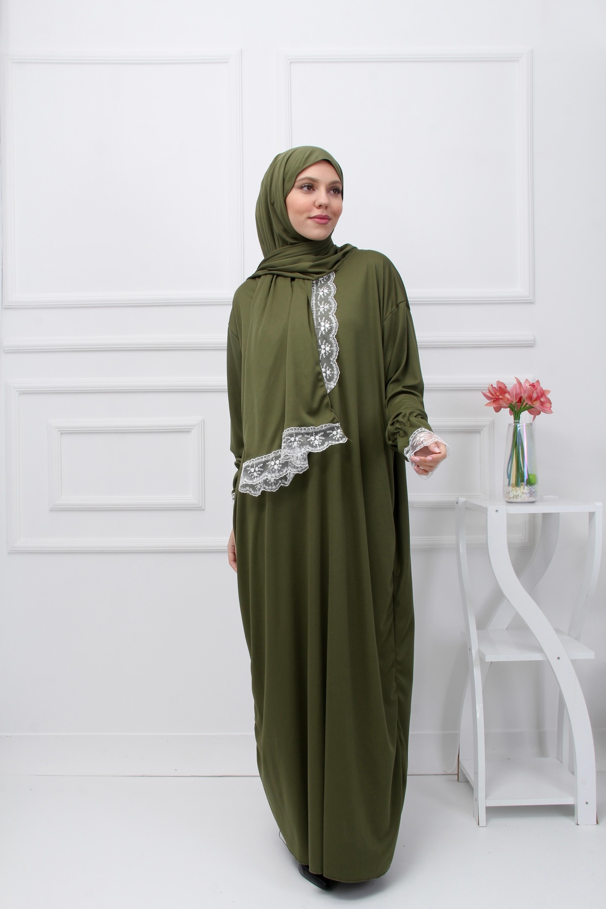 Tek parça kendinden şallı düz renk şık kadın namaz elbisesi, tesettür modasının en sevilen parçalarından. Vücut hatlarını gizleyen rahat kesimi, yumuşak dokusu ve özenli dikişleriyle konfor ve şıklığı bir arada sunar. Düğün, nişan, bayram veya günlük kullanım için ideal. Defkay güvencesiyle sunulmaktadır.
