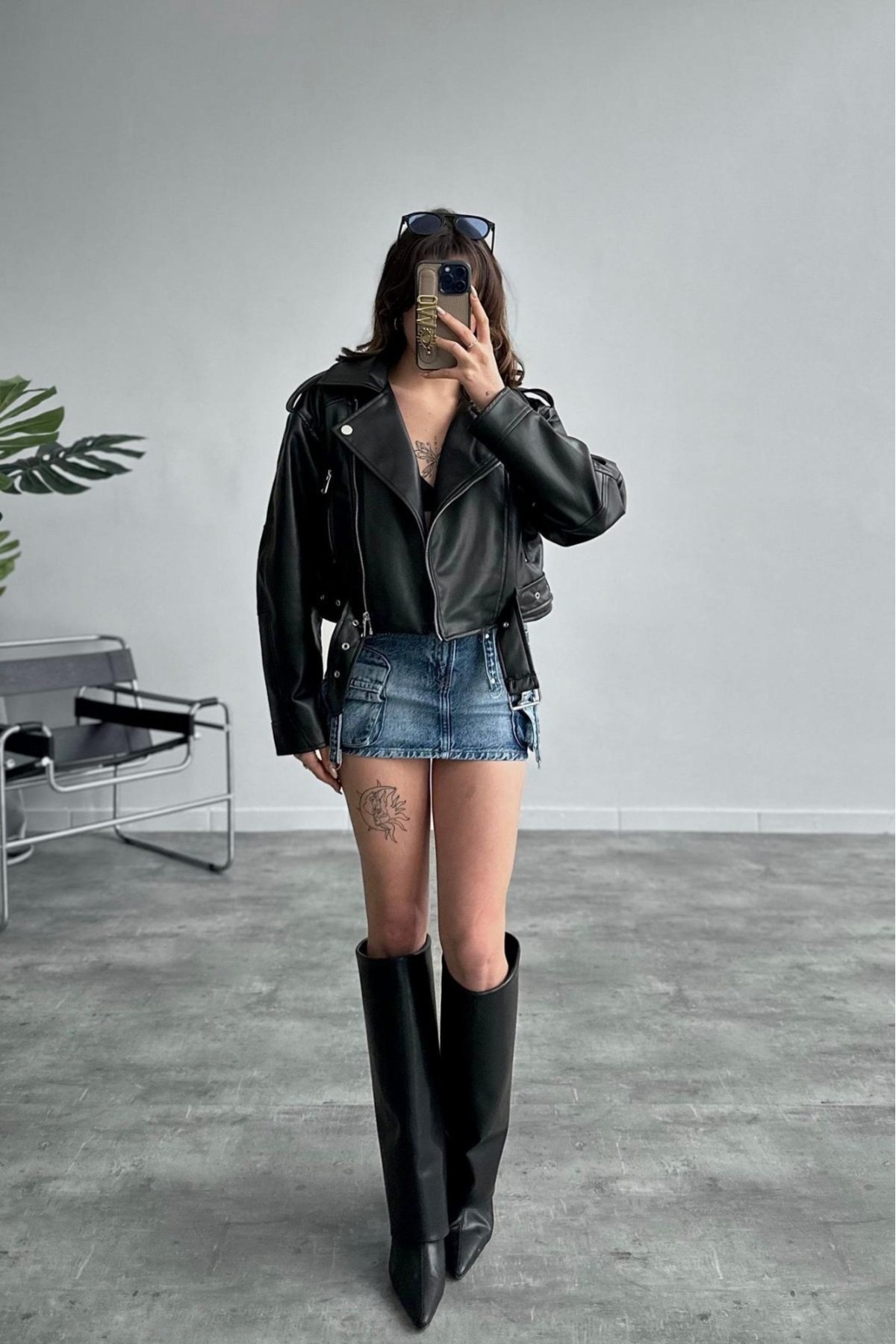 Yeni Sezon Oversize Kadın Siyah Biker Deri Ceket, modern çizgileri ve sofistike detaylarıyla gardırobunuzun vazgeçilmezi olacak. Özenle seçilmiş kumaşı vücutta rahat durur ve hareket özgürlüğü sağlar. Farklı kombinlerle hem günlük hem de davet stilinizi oluşturabilirsiniz. NET OF NOT güvencesiyle sunulmaktadır.